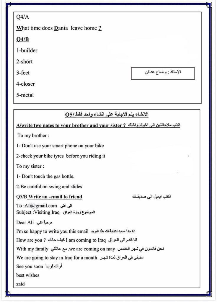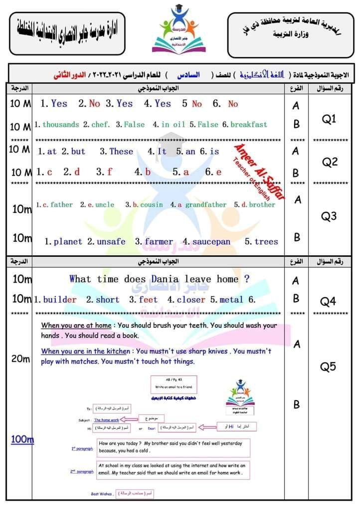حل اسئلة انكليزي سادس ابتدائي